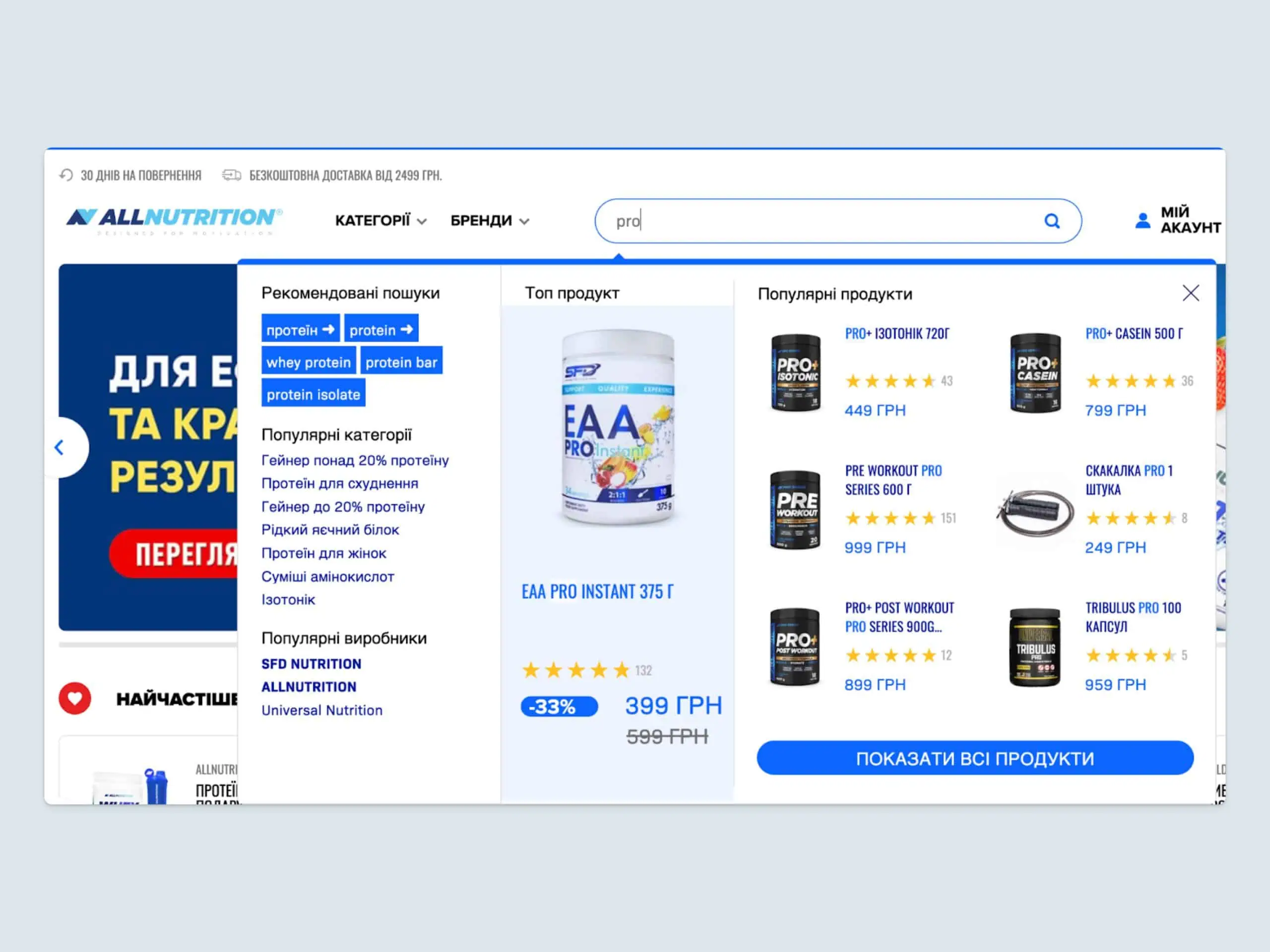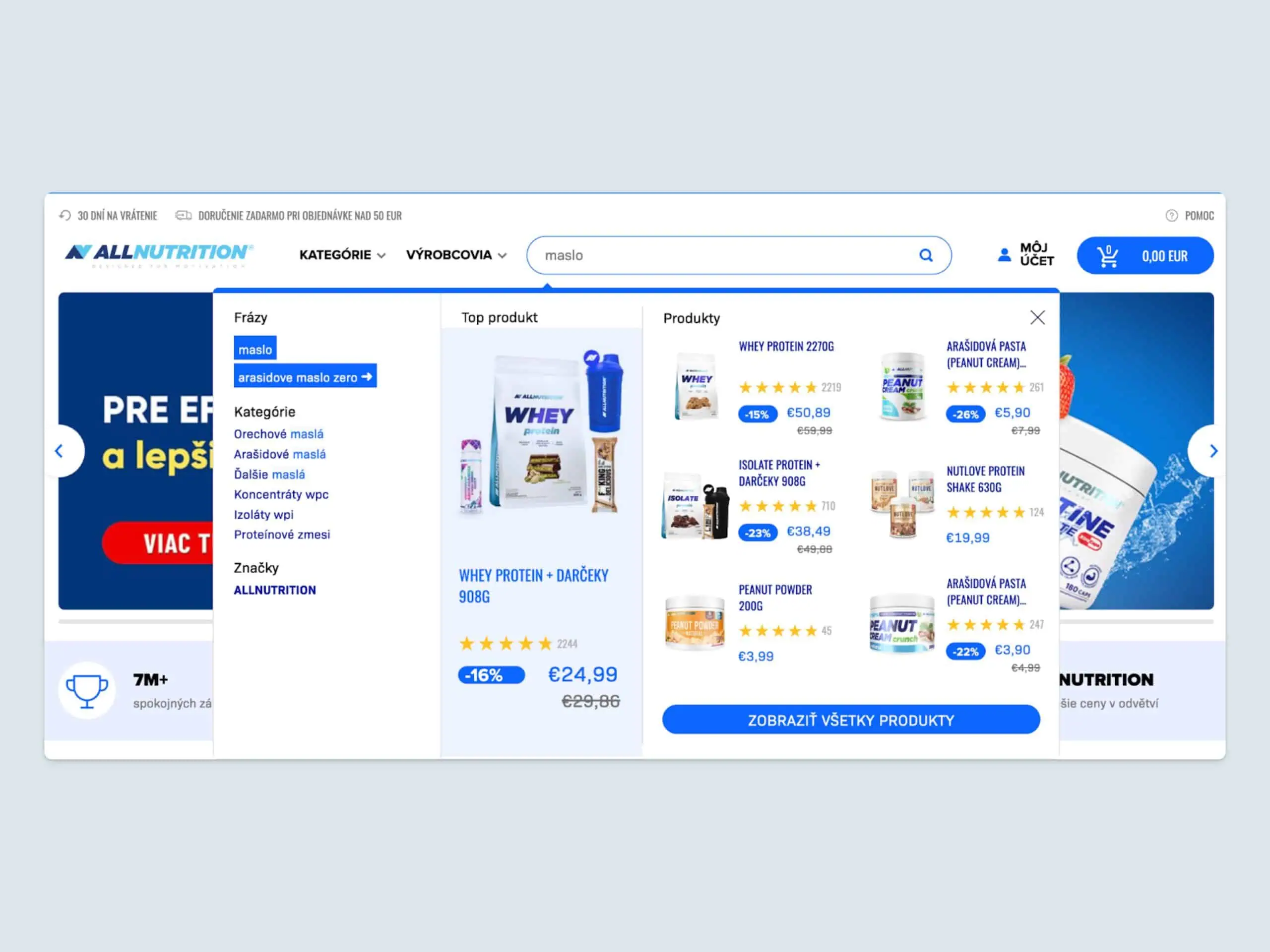 Napríklad v Autocomplete sú pri zvýraznených produktoch dopyty zobrazené modrou farbou, aby si ich zákazníci hneď všimli. Tím Luigi’s Box tieto úpravy podporil a zabezpečil optimálny výkon a užívateľskú prívetivosť.